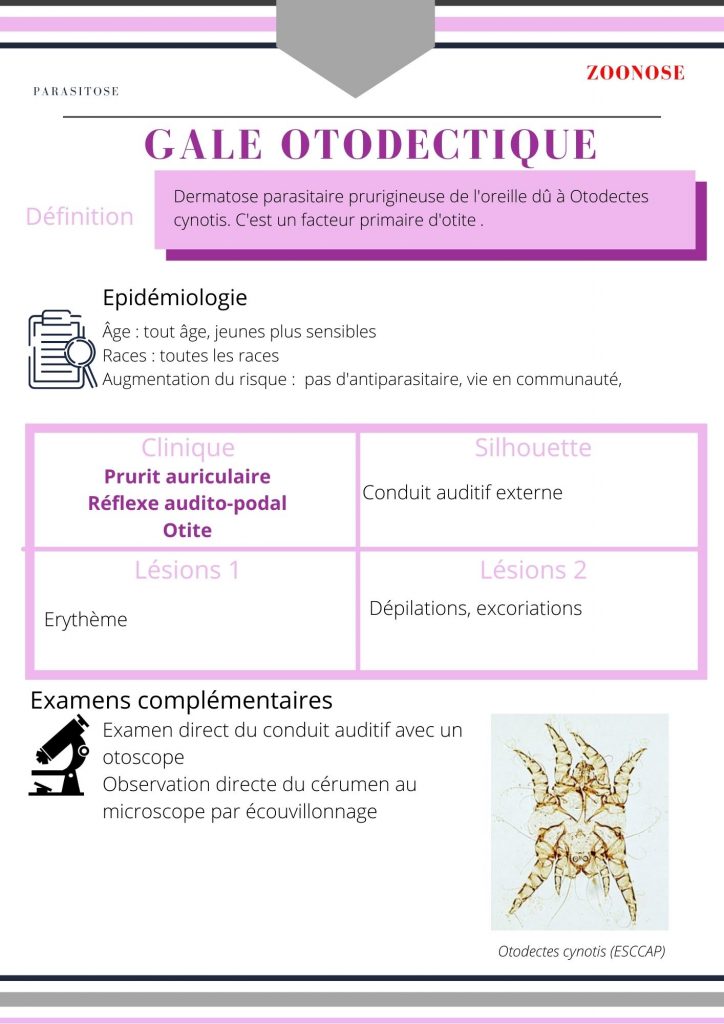 Gale des oreilles La gale otodectique, ou gale des oreilles, est une dermatose très fréquente, due à Otodectes cynotis.